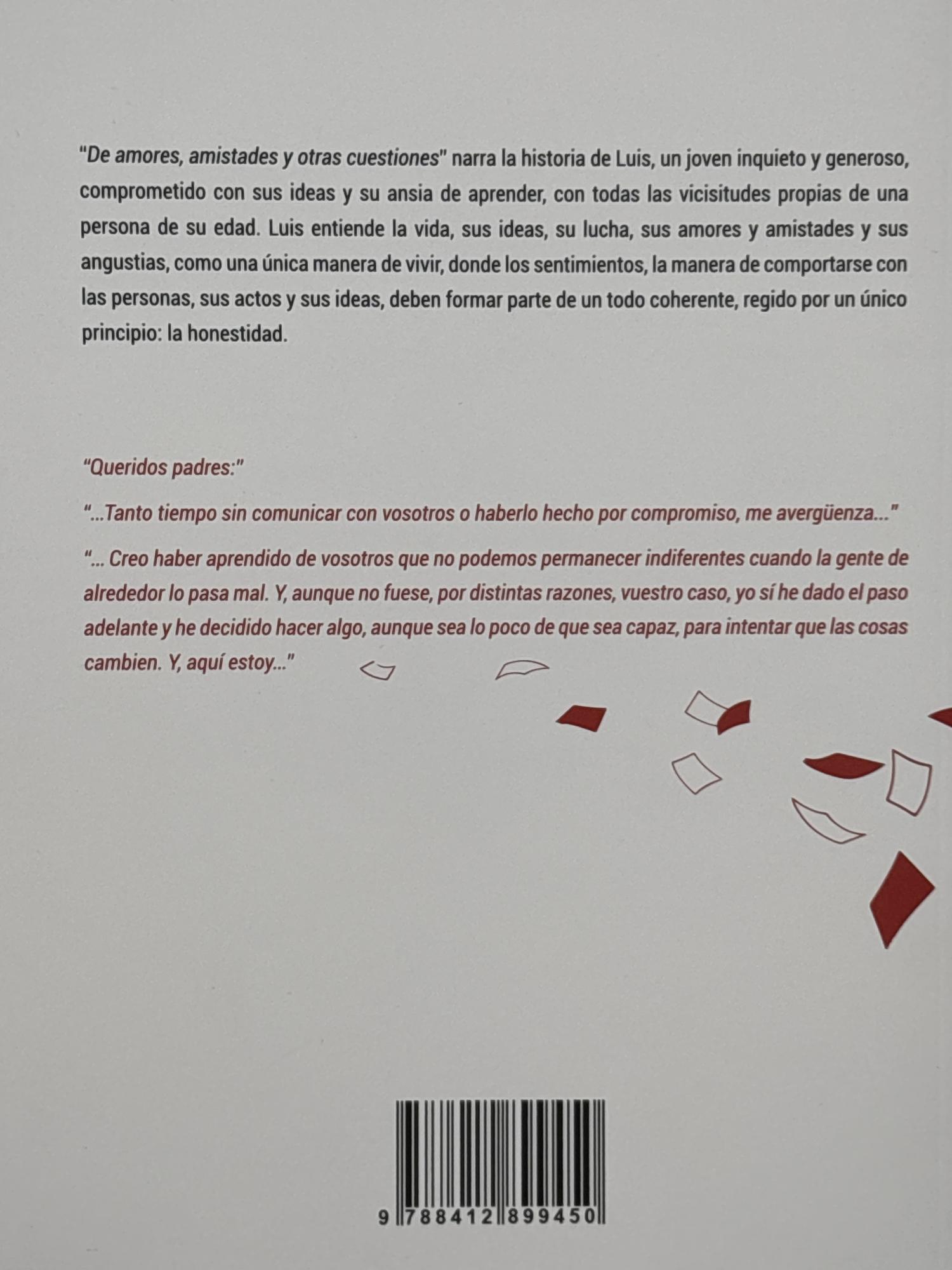La presente novela, "De amores, amistades y otras cuestiones", escrita en 2022, es una precuela de la ya publicada, "Una flor en el alero". Narra la historia de unos hombres y mujeres jóvenes comprometidos con la lucha antifranquista, y su proceso de toma de conciencia, partiendo de las experiencias personales más elementales, tanto políticas como sentimentales, vividas como un todo, como una manera de vivir, en aquellos años los sesenta del pasado siglo, tan duros de la dictadura franquista, en su plena decadencia.