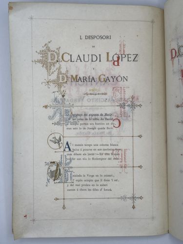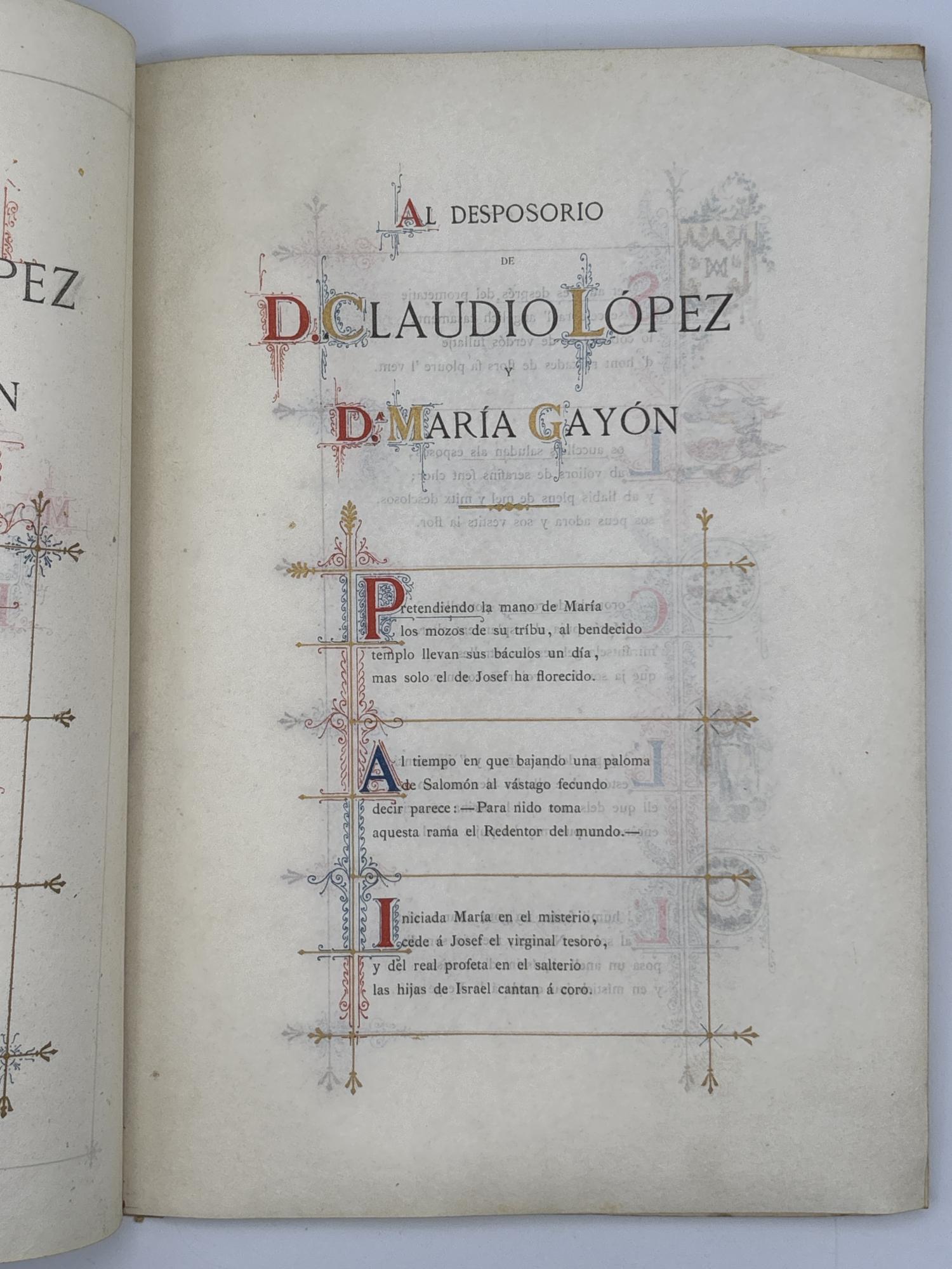 Hoja conmemorativa o poética vinculada al matrimonio del II marqués de Comillas, Claudio López Bru, con María Gayón y Chacón (enlace celebrado en 1881). Estas hojas se distribuían en ceremonias, actos religiosos o como recuerdo impreso.
