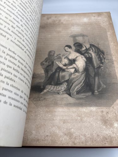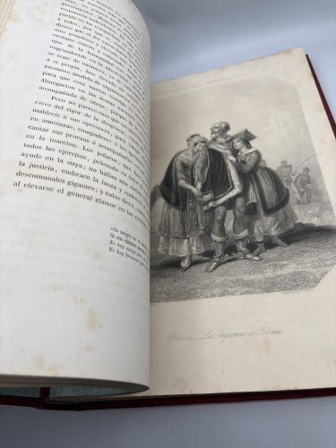 . T. I, 423 págs. 2 h. índice + 17 Láms. grabadas * T. II, 432 págs. 2 h. índice + XII págs. de suscritores + 35 Láms. Grabadas. Exquisitos grabados al Acero por los grabadores ingléses Finden, R. A. Artlett, W. & F. Holl, Pequeño círculo de humedad en los márgenes superiores sin afectar al texto ni a los grabados. Holandesa piel, nervios, Planos de tela gofrados.