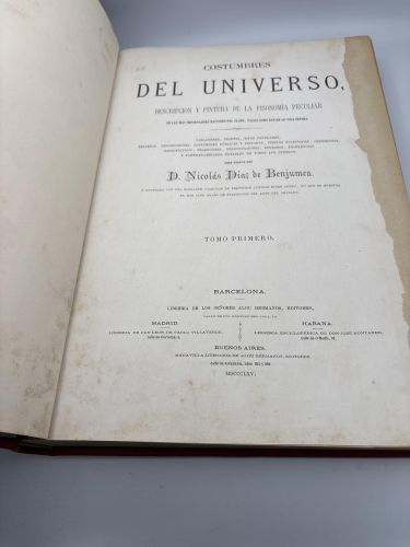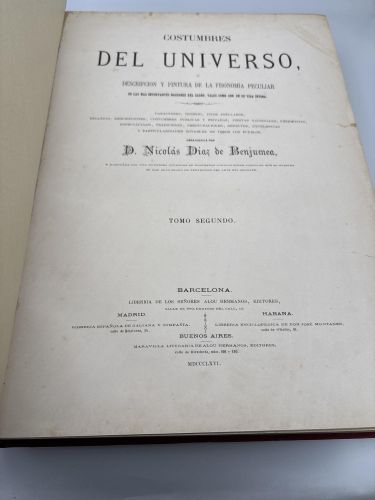 Costumbres del Universo, o Descripción y pintura de la fisonomía peculiar de las más importantes naciones del globo, tales como son en su vida íntima. Caractéres, ingenio, tipos populares, bellezas, descripciones, costumbres públicas y privadas, fiestas nacionales, ceremonias, espectáculos, tradiciones, preocupaciones, defectos, excelencias, y particularidades notables de todos los pueblos. Obra escrita por D. Nicolas Diaz de Benjumea é ilustrada con una elegante colección de riquísimas láminas sobre acero, en que se muestra el más alto grado de perfección del arte del grabado. Tomo Primero y Tomo segundo