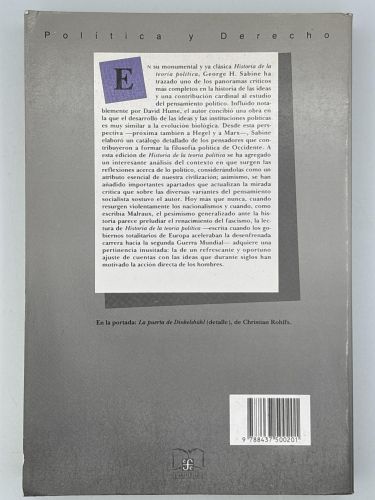 George H. Sabine estudia la evolución de las ideas políticas a través de los tiempos, desde la ciudad-Estado hasta las concepciones hoy vigentes, revisando con sumo cuidado las últimas investigaciones, con el fin de dar una perspectiva contemporánea al liberalismo, al comunismo, al fascismo y al nacional-socialismo.