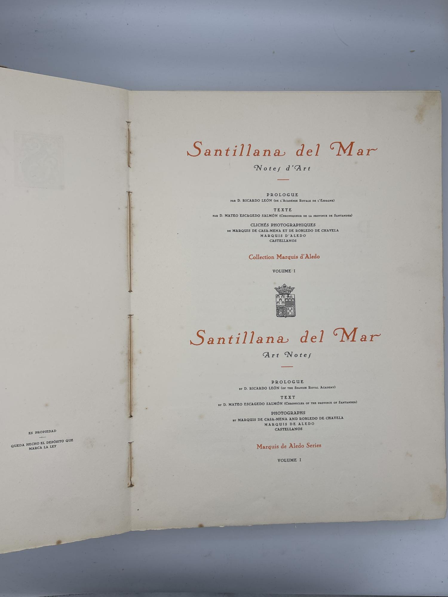 Título: SANTILLANA DEL MAR. Notas de Arte. Tomo I. Prólogo de Ricardo León. Texto de D. Mateo Escagedo Salmón. Colección Marqués de Aledo