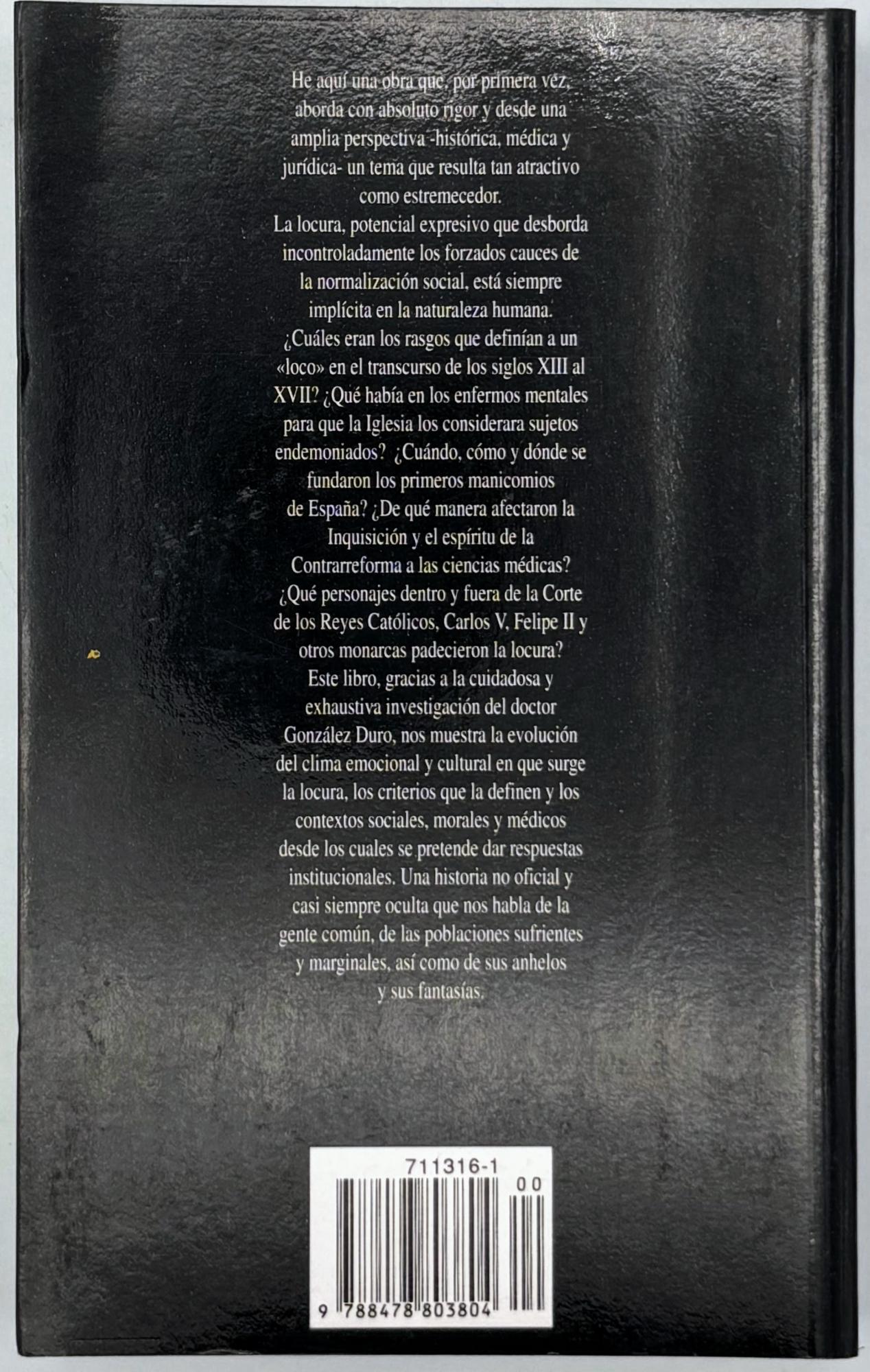 He aquí una obra que por primera vez aborda con absoluto rigor y desde una amplia perspectiva histórica, médica y jurídica, un tema que resulta tan atractivo como estremecedor. Este libro, gracias a la exhaustiva y cuidadosa investigación del doctor González Duro nos muestra la evolución del clima emocional y cultural en que surge la locura, los criterios que la definen y los contextos morales, sociales y médicos desde los que se pretende dar respuestas institucionales.