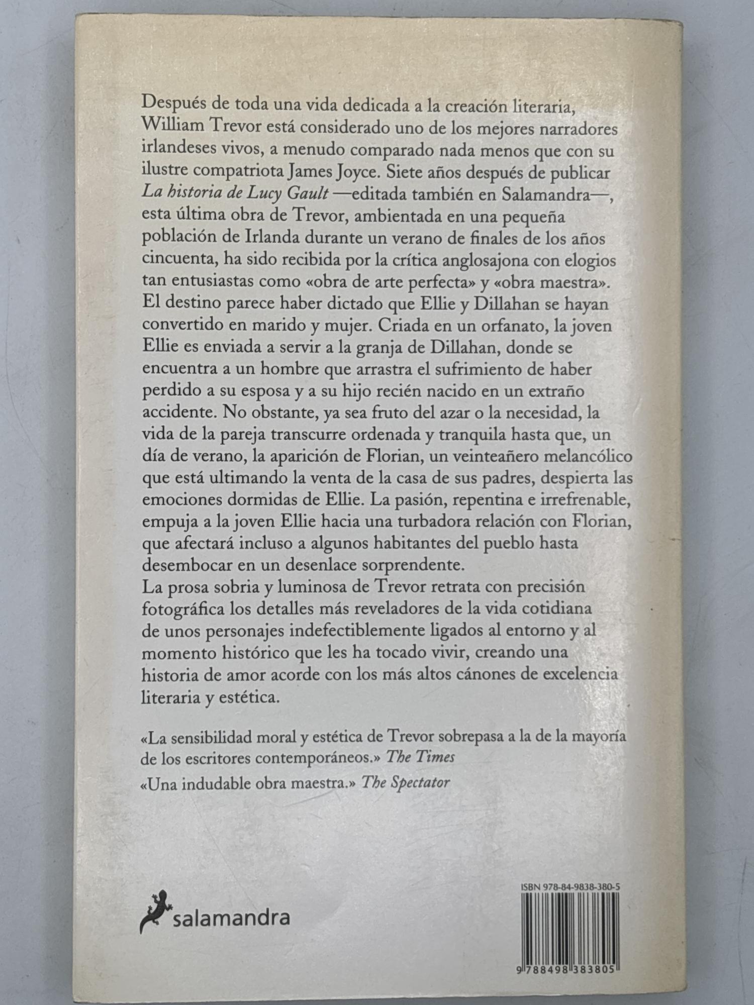 La prosa sobria y luminosa de Trevor retrata con precisión fotográfica los detalles más reveladores de la vida cotidiana de unos personajes indefectiblemente ligados al entorno y al momento histórico que les ha tocado vivir, creando una historia de amor acorde con los más altos cánones de excelencia literaria y estética.