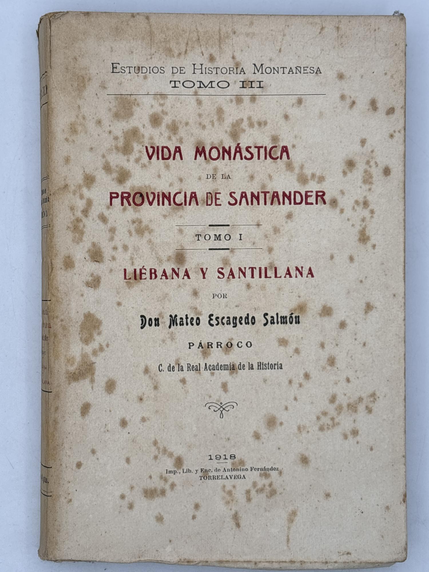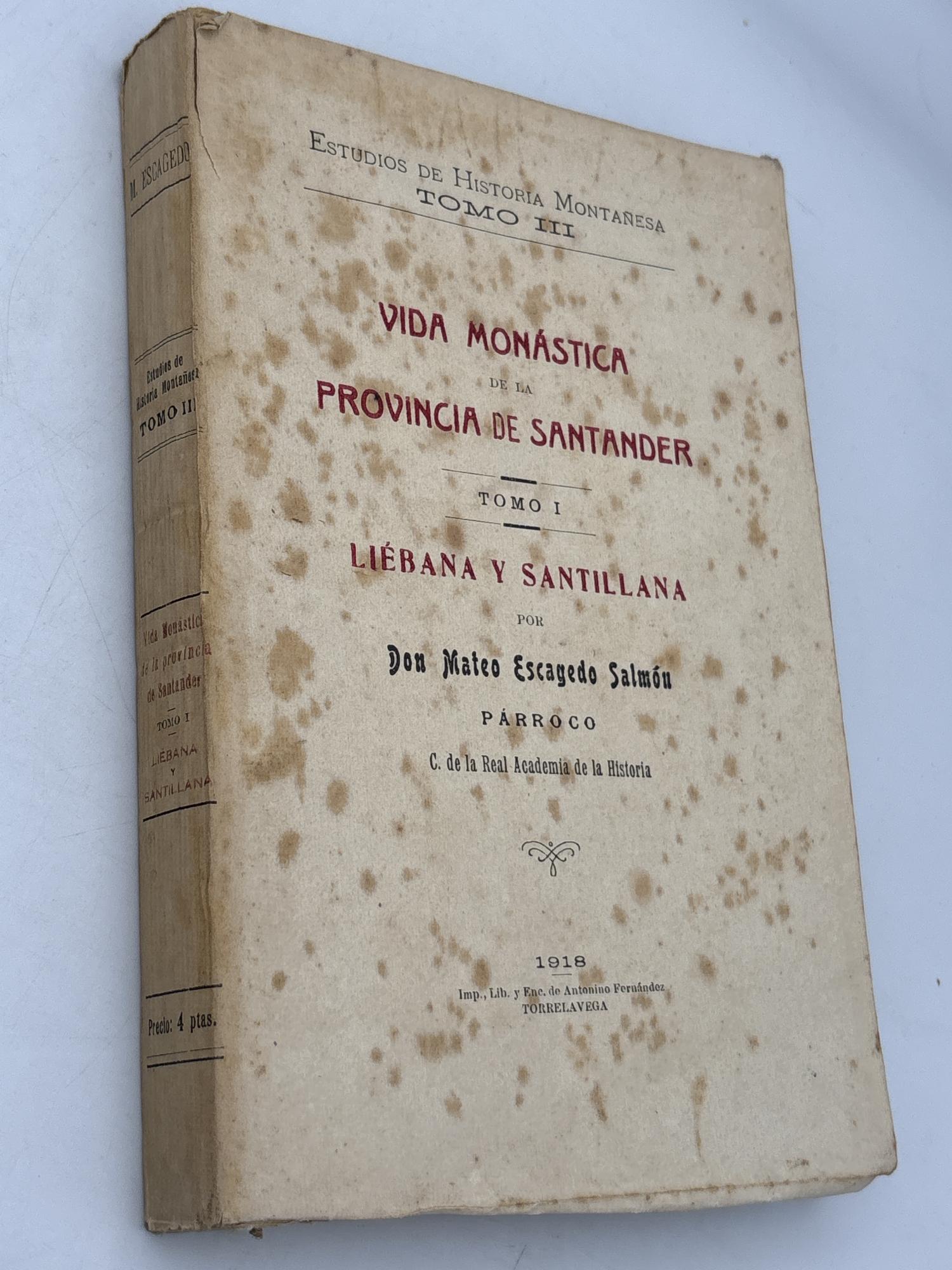 Escagedo Salmón, Mateo: Vida monástica de la provincia de Santander [Liébana y Santillana], Torrelavega, Imp. Lib, antonio Fernández, 1918, Rústica, 250 pág, 22x14